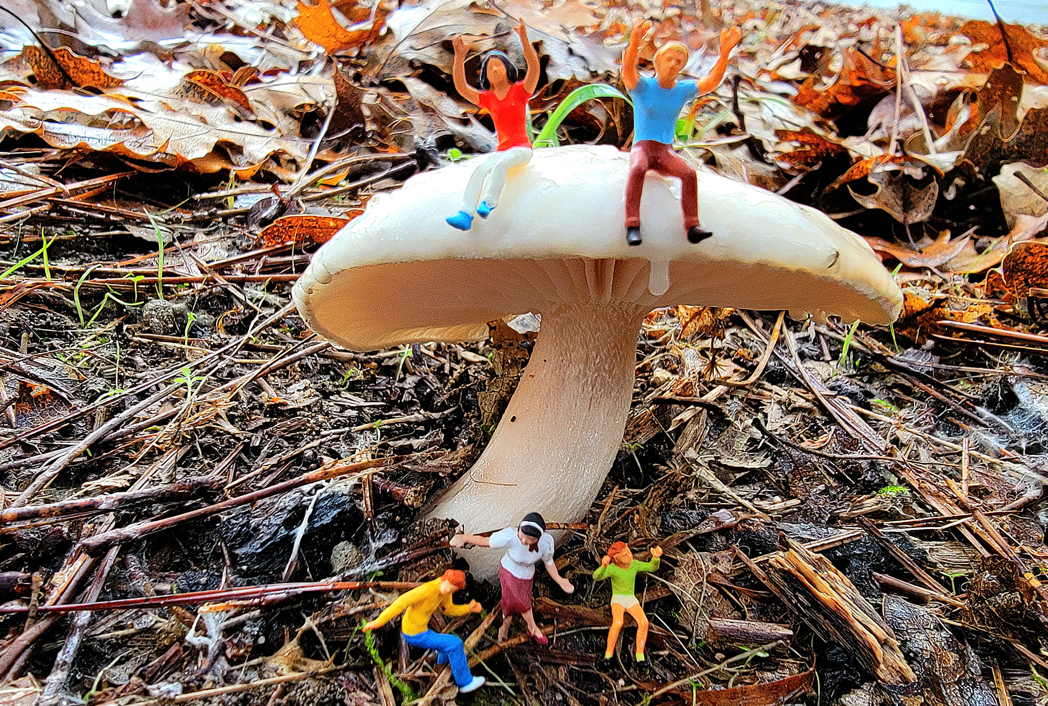 My macro photography of mushrooms found in nature involves embellishing the space the mushroom provides with props, most often HO-scale figures of people to evoke surprise and whimsy in the viewer. Connecting to viewers in this way breaks down the isolation of the world like mushrooms connect through mycelium.
